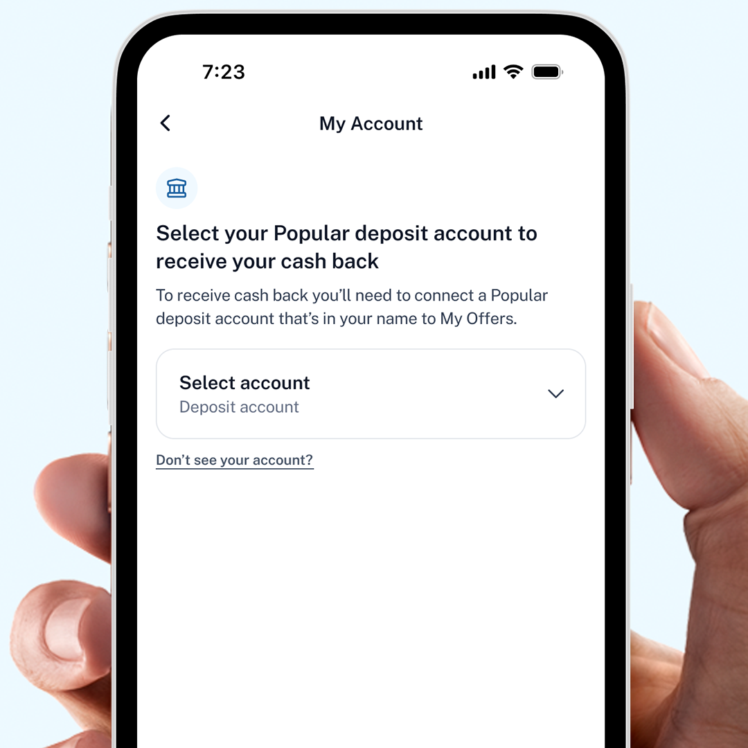 Cash back is a reward where you get back a percentage of the money from your purchases. With My Offers, you receive cash back directly to your Popular deposit account when you redeem through Mi BancoSM Mobile.